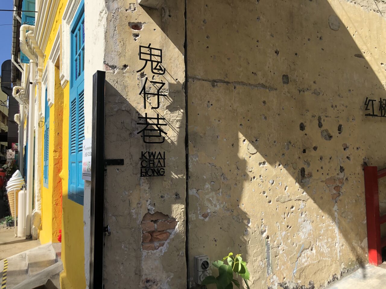 「鬼仔巷」の横にある黄色い壁