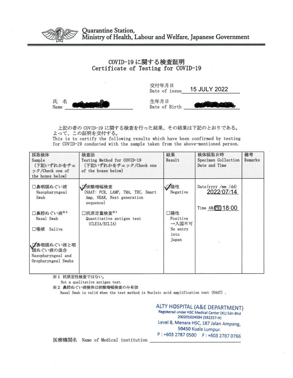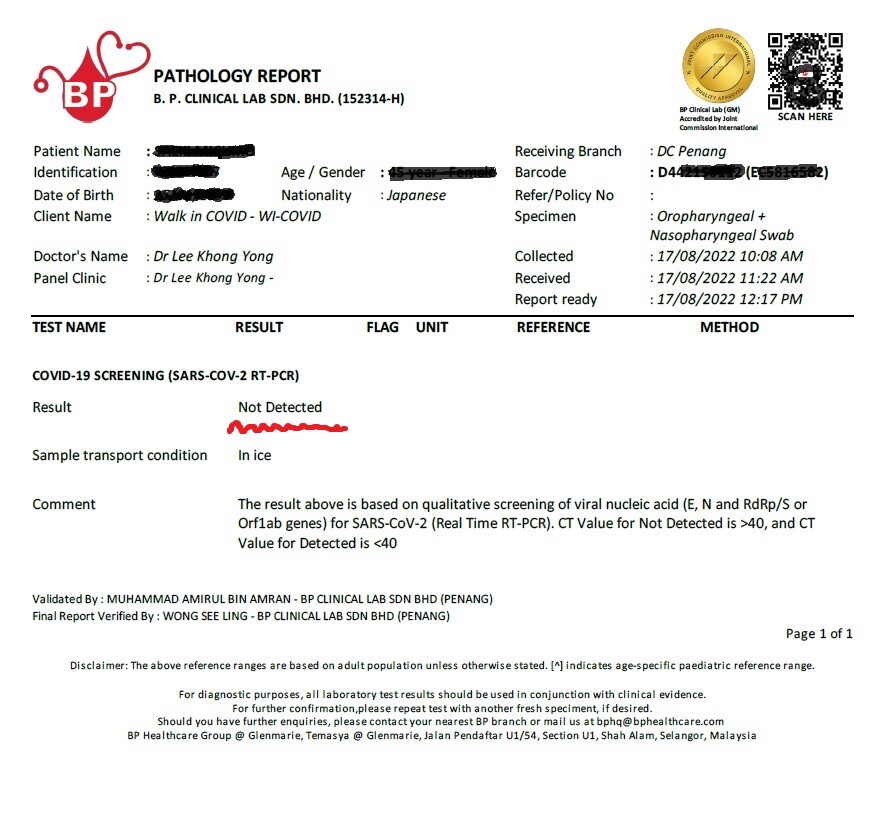 笑ちなみにマレーシアでの検査結果は