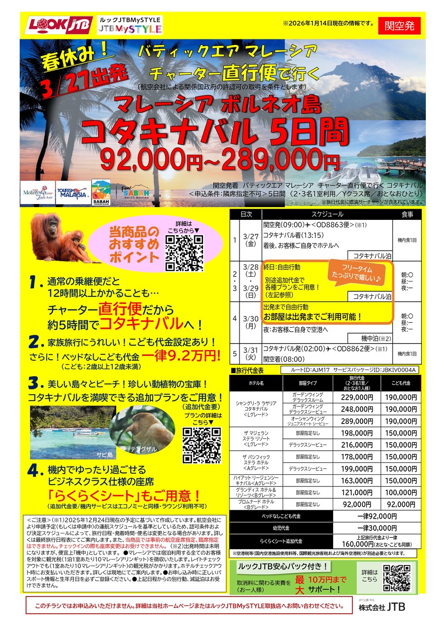 JTBさんからでた、コタキナバル行きチャーター便のご紹介!(^^♪
