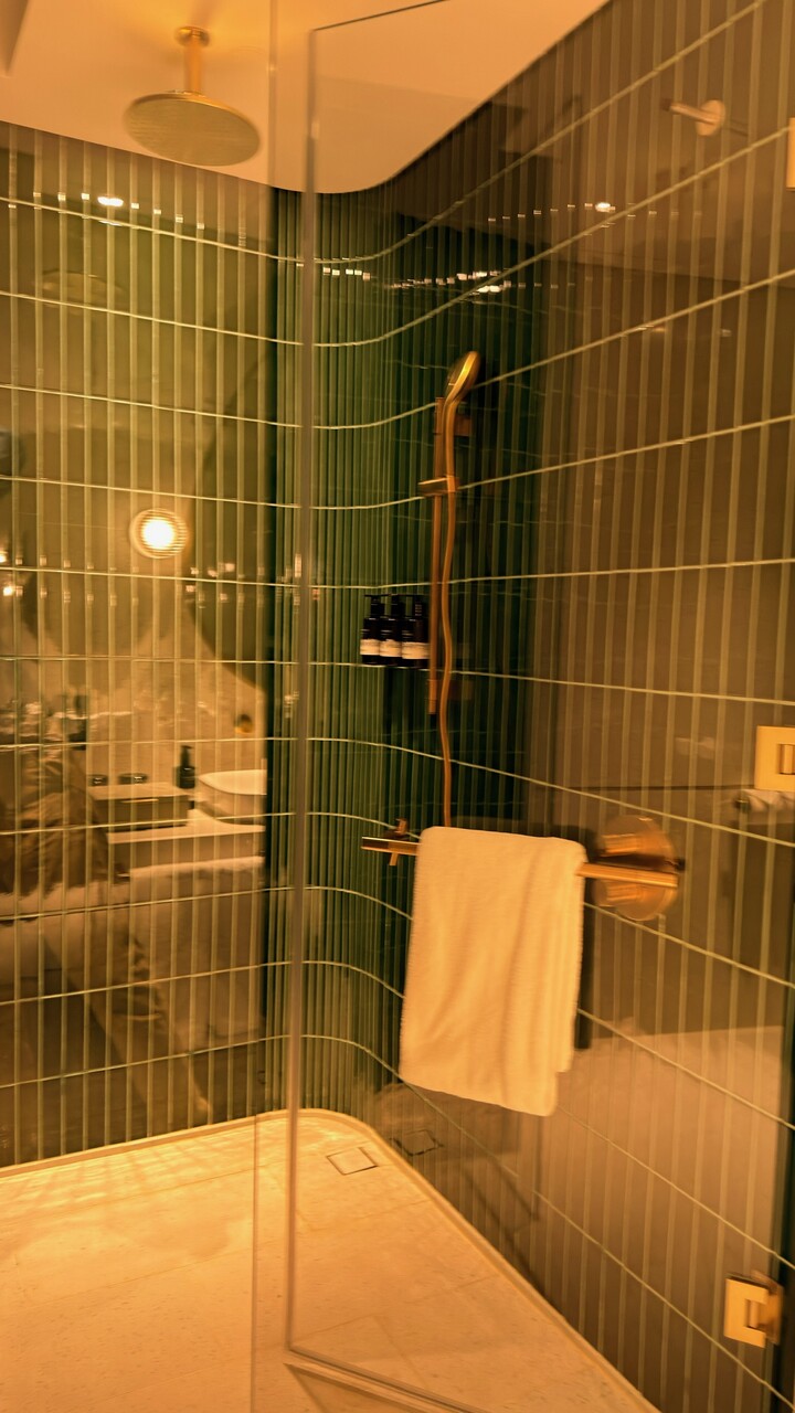 シャワールームは、深みのあるグリーンタイルが使用されており